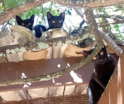 Os filhotes de pretinha já estão aparecendo, vivem no telhado de uma das casas vizinhas, que é onde ela costuma ter os filhotes. São 4.